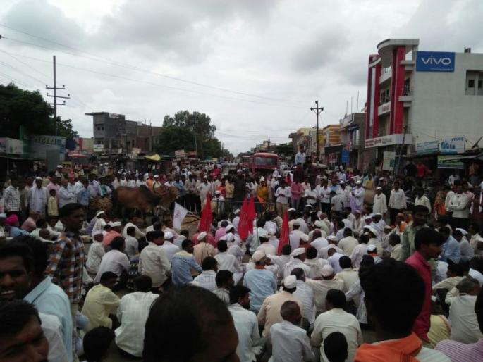 ऑनलाईन लोकमत औरंगाबाद, दि. १४ : शेतक-याला कोणतीही अट न लावता थकित व सरसकट कर्ज माफी द्यावी, स्वामीनाथन आयोगाची शिफारस लागु करावी, शेतक-याला रोहित्र द्यावेत ,शेती मालाला हमी भाव द्यावा या सह विविध मागण्यांसाठी सोमवारी सकाळपासूनच शेतकरी सुकाणू समिती व विविध संघटनांनी संपूर्ण मराठवाड्यात चक्काजाम केले. परभणी : शासनाने संपूर्ण कर्जमाफी द्यावी, या प्रमुख मागणीसाठी सुकाणू समितीच्या वतीने सोमवारी जिल्हाभरात ठिक ठिकाणी चक्काजाम आंदोलन करण्यात आले़ बैलगाड्यांसह सहभागी झालेल्या शेतकºयांनी रस्ते रोखून धरल्याने जिल्ह्यातील वाहतूक ठप्प झाली होती़राज्य शासनाने दिलेली कर्जमाफी फसवी असून, संपूर्ण कर्जमाफी द्यावी, स्वामीनाथन आयोगाच्या शिफारशी लागू कराव्यात, आॅनलाईन अर्ज करण्याची अट रद्द करावी आदी मागण्यांसाठी मंगळवारी सकाळी १० वाजेपासून जिल्ह्यात या आंदोलनाला सुरुवात झाली़ परभणी तालुक्यात परभणी-गंगाखेड या रस्त्यावर पोखर्णी फाटा, ब्राह्मणगाव येथे जोरदार आंदोलन करण्यात आले़ परभणी-वसमत रस्त्यावर खानापूर फाटा येथे, परभणी- जिंतूर रस्त्यावर टाकळी तर परभणी-पाथरी रस्त्यावर पेडगाव या ठिकाणी शेतकºयांनी रस्त्यावर उतरून चक्काजाम आंदोलन केले़ त्याच प्रमाणे सोनपेठ येथील मुख्य चौकात, गंगाखेड येथे नांदेड-पुणे राज्य मार्गावर, पालम-गंगाखेड मार्गावर सकाळपासून चक्काजाम आंदोलन केले़ त्यामुळे जिल्हाभरातील वाहतूक ठप्प झाली होती़ सुमारे दोन तासांपासून हे आंदोलन सुरू आहे़ आंदोलना दरम्यान, शेतकºयांनी शासन विरोधी घोषणा देवून परिसर दणाणून सोडला़गंगाखेड -पाथरी - सोनपेठ - टाकळी- बीड : परळी - बीड मार्गावर तेलगाव येथे व गेवराई - बीड या महामार्गावर पाडळसिंगि येथे शेतक-यांचा रास्ता रोको सुरु. गेवराई - गेवराई तालुका सुकानु समिती च्या वतीने सोमवार रोजी सकाळी शेतक-याच्या विविध मागण्यांसाठी तालुक्यातील जातेगांव फाटा , सिरसदेवी, चकलांबा फाटा,पाडळसिंग, मादळमोही, कोळगावं येथे रस्ता रोको करण्यात आला यावेळी अनेक शेतकरी सह महिला उपस्थित होत्या. शेतक-याला कोणतीही अट न लावता थकित व सरसकट कर्ज माफी द्यावी, स्वामीनाथन आयोगाची शिफारस लागु करावी, शेतक-याला रोहित्र द्यावेत ,शेती मालाला हमी भाव द्यावा ,सह विविध मागण्यांसाठी सोमवार रोजी सकाळी गेवराई तालुका सुकानु समितीच्या वतीने तालुक्यातील गढी माजलगावं रोड वरिल जातेगांव फाटा ,पाडळसिंग, चकलांबा फाटा,कोळगावं, सिरसदेवी फाटा सह विविध ठिकाणी शेतकरी व महिलानी अर्धा तास काही ठिकाणी एक तास रस्ता रोको केला.त्यामुळे रस्त्यावर दोन्ही बाजुने वाहनाच्या रांगा लागल्या होत्या.यावेळी मोठा पोलीस बंदोबस्त ठेवण्यात आला होता.माजलगाव - धारूर - हिंगोली : 