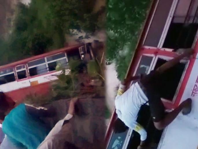 1 / 6 या अपघातादरम्यान रोडवेज बसमधील प्रवासी धसक्यातून सावरत आहेत. अपघात पाहून ग्रामस्थांची गर्दी घटनास्थळी जमली. बसमध्ये अडकलेल्या लोकांना सुरक्षित बाहेर काढले जात आहे, दुसरीकडे माहिती मिळाल्यानंतर पोलिस आणि प्रशासकीय अधिकारीही घटनास्थळी दाखल झाले. (All Photo - Aaj Tak)2 / 6 कानपूरच्या बिल्हौरमधील जीटी रोडवर हा अपघात झाला. मुसळधार पाऊस पडत असल्याचे सांगण्यात आले. यादरम्यान प्रवाशांसह कानपूरहून येणारी बस अचानक अनियंत्रित झाली. येथून बस येत असताना नदीत कोसळली. या अपघातानंतर बसमधील प्रवाशांमध्ये मदतीसाठी आरडाओरडा केला. अपघात पाहून धाव घेतलेल्या ग्रामस्थांनी केवळ पावसात शिडी लावून प्रवाशांना सुखरुप बाहेर काढण्यास सुरवात केली.3 / 6या अपघातादरम्यान प्रवासी खूप घाबरले. बसमधून बाहेर पडण्यासाठी कोणीतरी काचेच्या खिडक्या तोडून, तर कोणी नदीत उडी मारून आपला जीव वाचविला. मात्र, यावेळी महिला असहाय्य झाल्या.4 / 6 बस नदीत कोसळू नये म्हणून बसच्या एका टोकाला ग्रामस्थांनी दोरीने बांधले होते. यासह, महिलांना बाहेर काढण्यासाठी शिडी वापरली गेली, जेणेकरून त्यांना सुरक्षित बाहेर काढता यावे.5 / 6घटनेची माहिती मिळताच स्थानिक पोलिस व प्रशासकीय अधिकारी घटनास्थळी दाखल झाले. 6 / 6सुदैवाने नदीत पाणी कमी होते, त्यामुळे सर्व प्रवाशांना बसमधून सहज बाहेर काढता आले.