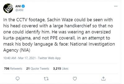 त्याचसोबत बॉडी लॅग्वेंज आणि चेहरा लपवण्यासाठी त्यांनी मोठ्या आकाराचा कुर्ता-पायजमा घातला होता, पीपीई किट्स नाही असं त्यांनी सांगितले आहे. तसेच सचिन वाझे यांच्या कार्यालयात NIA ने छापा टाकला होता, त्यात लॅपटॉप जप्त केला, त्यातील डेटा आधीच डीलिट करण्यात आला होता