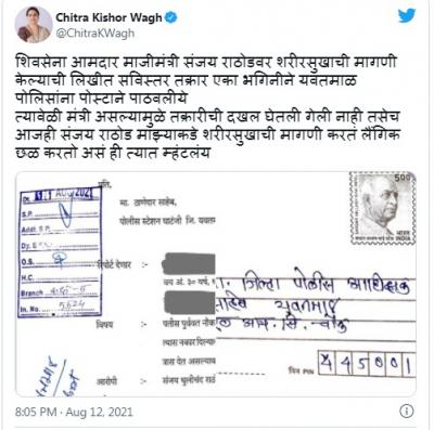 शिवसेना नेते संजय राठोड यांनी माझ्याकडे शरीरसुखाची मागणी केली आहे, अशी लिखित तक्रार एका महिलेने केली आहे. भाजप नेत्या चित्रा वाघ यांनी ट्विटरच्या माध्यमातून याबाबत माहिती दिली आहे.