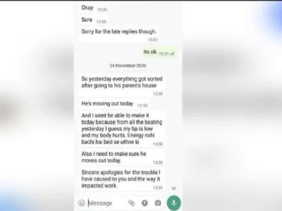 "कालच्या मारहाणीमुळे माझे माचे शरीर दुखत आहे. अंथरुणावरून उठण्यासाठी शरीरात उर्जा उरलेली नाही" असंही तिने मेसेजमध्ये म्हटले आहे. यात तिने तिच्यामुळे झालेल्या गैरसोयीबद्दल आणि कामाच्या नुकसानीबद्दल दिलगीर व्यक्त केली आहे.