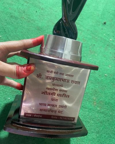 "माजी मंत्री तथा आमदार जयकुमारभाऊ रावल यांच्या वाढदिवसानिमित्त आयोजित कार्यक्रमात आमदार जयकुमारभाऊ रावल यांच्या हस्ते माझा खान्देश कन्या म्हणून गौरव करून सत्कार करण्यात आला. त्याबद्दल मी त्यांची आभारी आहे.