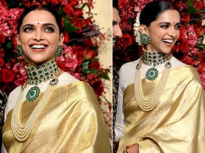 दीपिका पादुकोणने बंगळुरू रिसेप्शन दरम्यान डिझायनर सब्यासाचीने डिझाइन केलेल्या कांजीवरम गोल्डन साडीसोबत हेरिटेज ज्वेलरी कॅरी केली होती. दीपिकाने सब्यासाचीने डिझाइन केलेला रियर कोलंबियाई पन्ना, रोज-कट डायमंड चोकर नेकलेस आणि ईयरिंग्ज परिधान केल्या होत्या. हे सर्व दागिने दीपिकाल शाही लूक देत होते.
