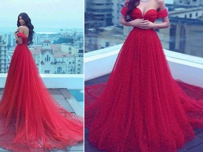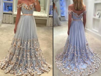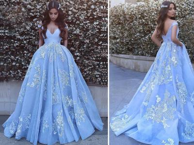 स्काय ब्लू ऑफ शोल्डर विद वी-बॅकनेक गाऊन डिझाईन