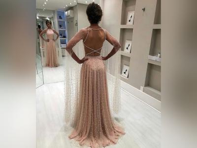 पर्ल स्टोन्स वर्क विद ट्रान्सपरंट बॅकनेक गाऊन