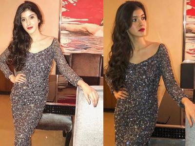 मागील काही दिवसांमध्ये shimmery आणि glitteryड्रेसेस फार ड्रेंडमध्ये आहेत. शनायादेखील अॅश ब्ल कलरच्या फुल स्लीव्सच्या ड्रेसमध्ये अत्यंत सुंदर दिसत आहे.