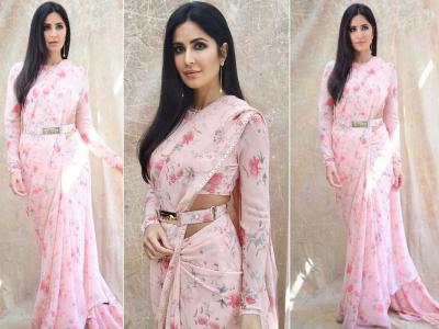 कतरिना डिझायनर सब्यासाची मुखर्जी यांच्या बेबी पिंक फ्लोरल बेल्ट स्टाइल साडीमध्ये दिसून आली होती. ज्यासोबत तिने फुल स्लीव्स ब्लाउज कॅरी केला होता.