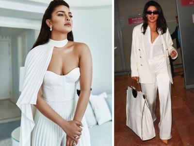 रेड कार्पेटव्यतिरिक्त कान्सच्या वेगवेगळ्या इव्हेंटमध्ये प्रियांका व्हाइट कलरच्या ड्रेसमध्ये दिसून आली. पार्टीसाठीही तिने व्हाइट कलरचा ऑफ-शोल्डर कॉर्सेट स्टाइल पॅन्ट सूट वेअर केला होता. तसेच कान्समध्ये एन्ट्री करताना प्रियांकाने ऑफ व्हाइट कलरच्या सॅटिन ब्लेजर आणि मॅचिंग कलरच्या फॉर्मल पॅन्ट वेअर केली होती.