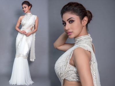 सणांना डिझायनर साडी देखील ट्राय करू शकता. मौनीने व्हाईट साडीसोबत हॉल्टर नेक लूक असलेलं ब्लाउज परिधान केलं आहे.