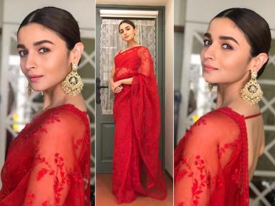 काही दिवसांपूर्वी आलियाने लाल रंगाची साडी परिधान केली होती. ज्यावर थ्रेड वर्क करण्यात आलं होतं. यासोबतच तिने सोनेरी रंगाचे झुमके घालणं पसंत केलं. आलियाप्रमाणे तुम्हीही असा लूक नक्की ट्राय करा.