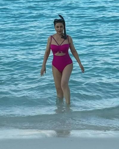 मालदीवच्या निळ्याशार समुद्राच्या पाण्यातून ती गुलाबी बिकिनी घालून बाहेर येताना दिसते. तिचा हा फोटो पाहून चाहत्यांना कमालीचं आश्चर्य वाटत आहे. याही वयात तिचा हा अंदाज लक्षवेधी आहे.