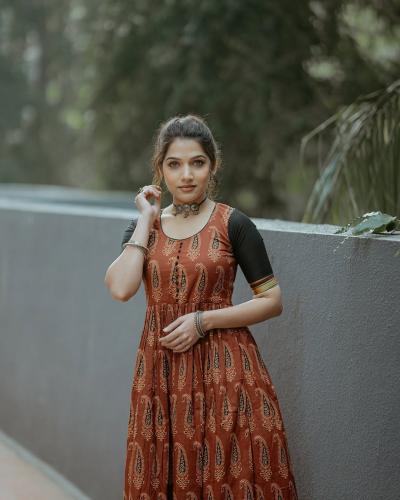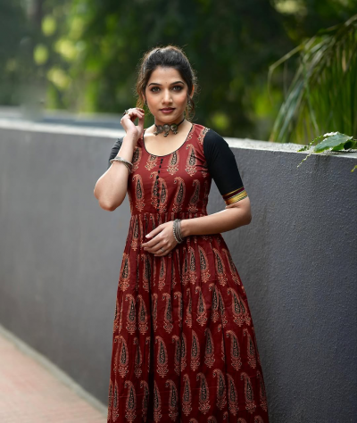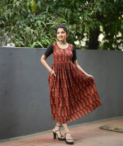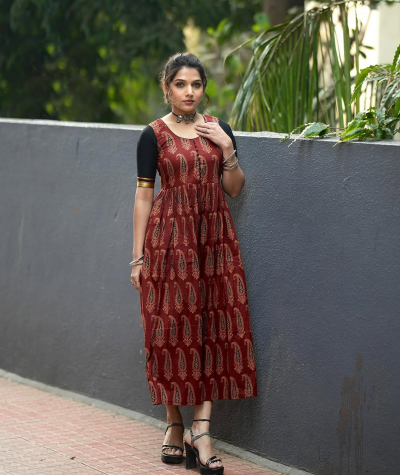 या फोटोशूटसाठी जान्हवीने गडद लाल रंगाचा अजरक कॉटन ड्रेस परिधान केला आहे.