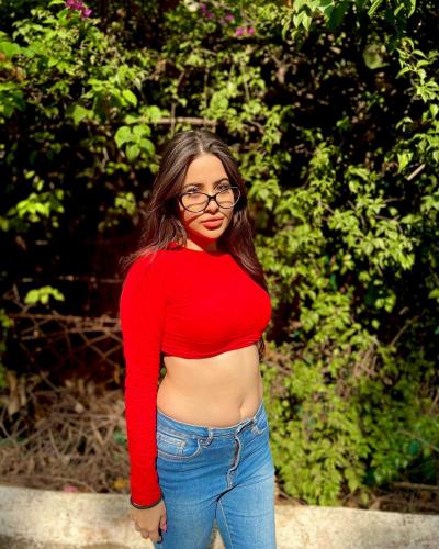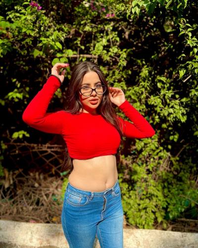उर्फी जावेद या फोटोंमध्ये लाल रंगाचा टॉप घातलेला दिसत आहे आणि तिच्या डोळ्यांवर चष्मा आहे.