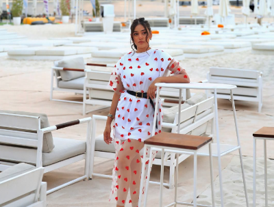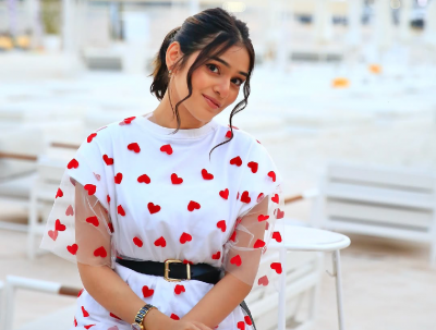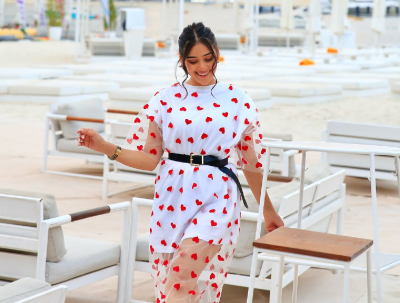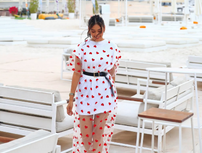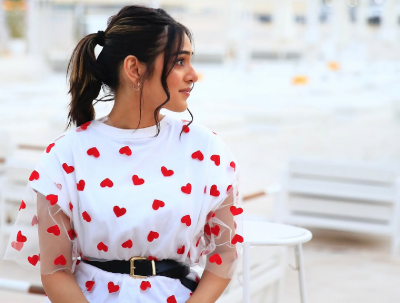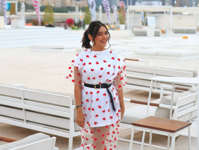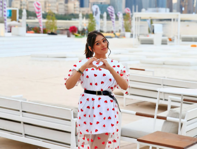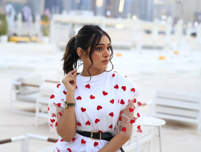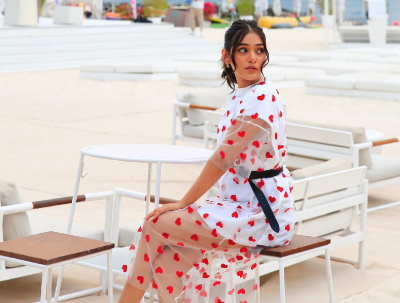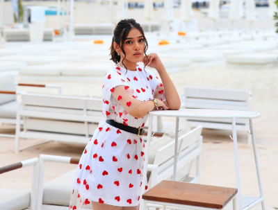 या फोटोमध्ये तिनं पांढऱ्या रंगाचे कपडे परिधान केलेले दिसत आहे. पांढऱ्या रंगाच्या ड्रेसवर लाल रंगाचा हार्ट आहेत.
