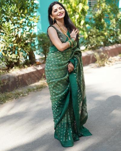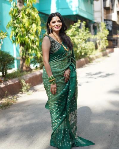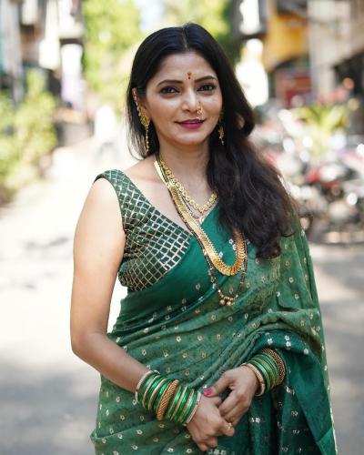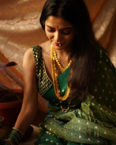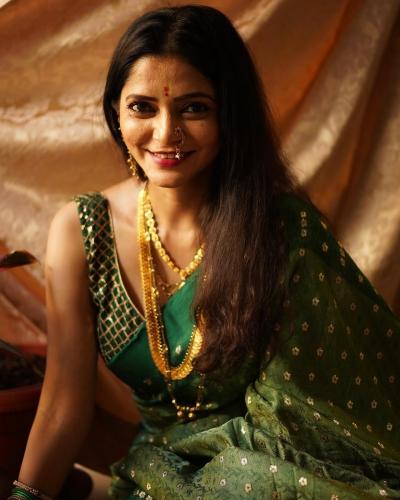 या फोटोशूटमध्ये वैशालीने हिरव्या रंगाची साडी नेसली आहे. नाकात नथ घालून तिने तिचा पारंपारिक लूक पूर्ण केला आहे.