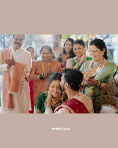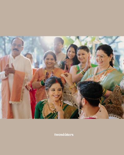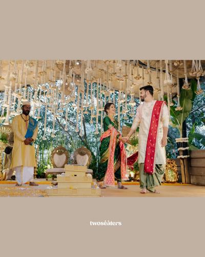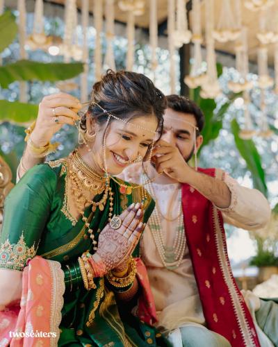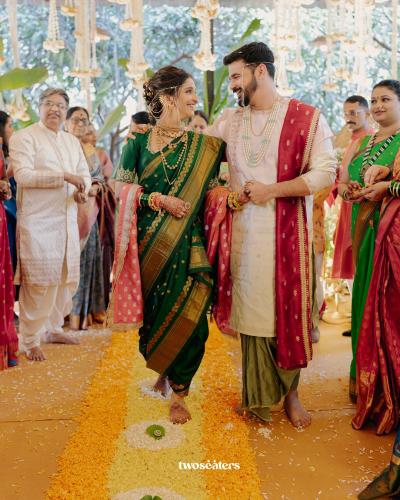 आपल्या लग्नासाठी दोघांहीनी सुंदर अशी वेशभूषा केली आहे. शिवानीने हिरव्या रंगाची साडी नेसली आहे. त्यावर नाकात नथ, गळ्यात नेकलेस घालून लूक पूर्ण केलाय. तसेच तिने आबोली रंगाचा शेला घेतलाय.