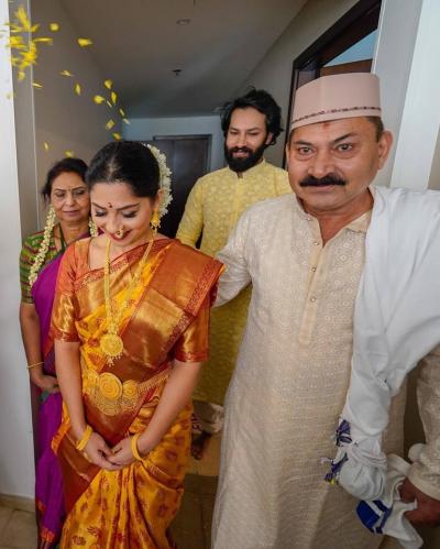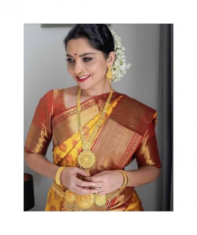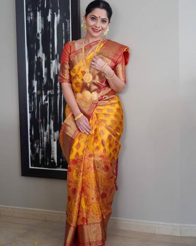 या फोटोंमध्ये सोनालीने पिवळ्या रंगाची कांजीवरम साडी नेसलेली आहे.