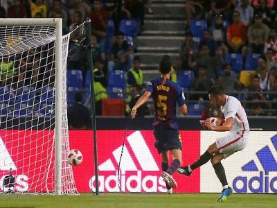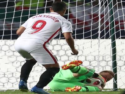 बार्सिलोनाचा गोलरक्षक मार्क-आंद्रे स्टीगन याने सेव्हिया क्लबच्या विस्सॅम बेन येड्डेरचा गोल करण्याचा प्रयत्न अडवला.