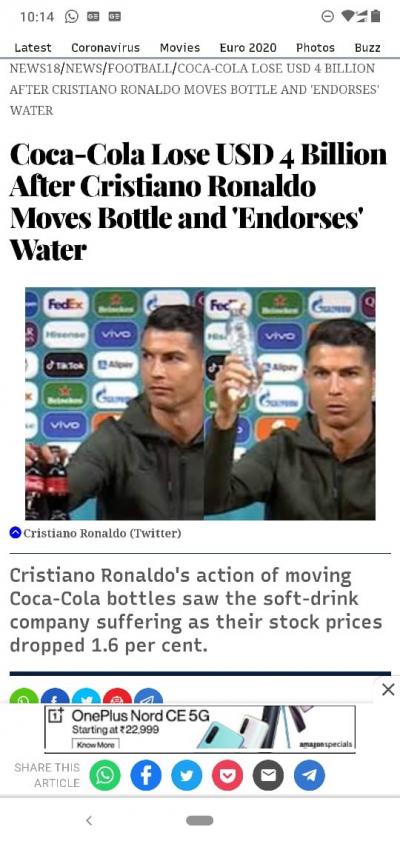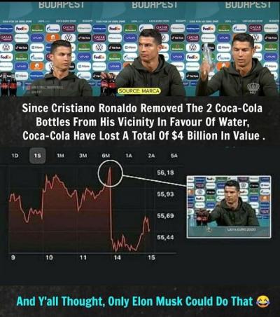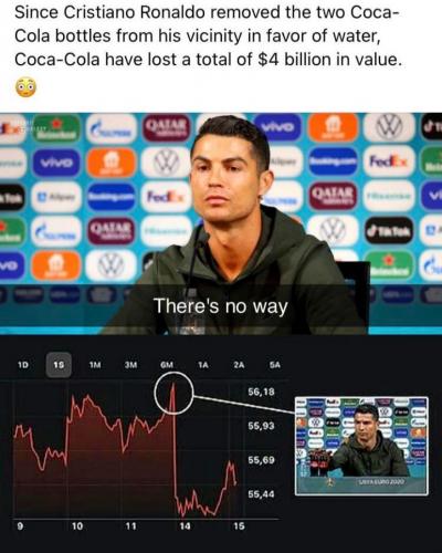 आता रोनाल्डोनं Coca Cola च्या दोन बॉटल्स हलवल्या अन् दुसरीकडे शेअर बाजारही गडगडला. रोनाल्डोच्या त्या कृतीनं Coca Colaचे स्टॉक्स 1.6% टक्क्यांनी कोसळून ते 242 बिलियन अमेरिकन डॉलरवरून 238 बिलियन अमेरिकन डॉलरवर आले.