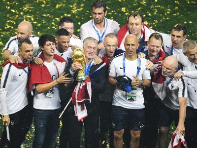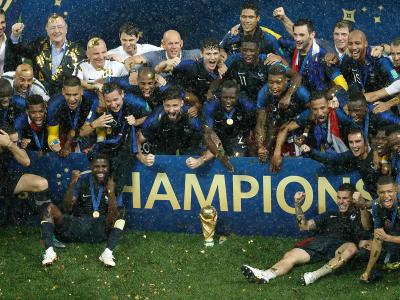 फिफा विश्वचषकाला दुसऱ्यांदा गवसणी घालणारा फ्रेंच संघ विश्वचषकासह आनंद व्यक्त करताना.