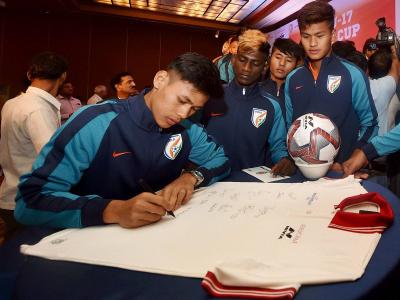 नवी दिल्लीत आसोचॅम इंडस्ट्रीने आयोजित केलेल्या कार्यक्रमात भारताच्या अंडर-17 वर्ल्डकप संघातील फुटबॉलपटू जर्सीवर स्वाक्षरी करताना.