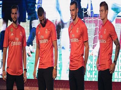 एका कार्यक्रमात या जर्सीचे अनावरण झाले. त्यावेळी रेयालचे नॅचो (डावीकडून), बेंझेमा, गॅरेथ बेल आणि टोनी क्रुस हे व्यासपीठावर उपस्थित होते.