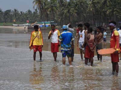 सुरक्षारक्षक पर्यटकांना पाण्यात न जाण्याचा इशारा देत आहेत.