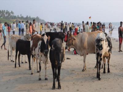 गोव्याच्या किनाऱ्यावर पर्यटकांसोबत स्थानिकांची गुरेही दिसत आहे.