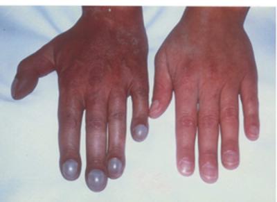 रक्तामध्ये ऑक्सिजनचं प्रमाण पुरेसं नसले तर अशा व्यक्तीची त्वचा निळसर-जांभळ्या रंगाची दिसते, विशेषतः ओठांभोवती आणि नखांच्या मुळाशी. फुफ्फुसांच्या गंभीर आजारांमुळं सायनोसिस अचानक उद्भवू शकतो किंवा फुफ्फुसांची स्थिती वर्षानुवर्षं बिघडत गेल्यास सायनोसिसचीही लक्षणे दिसत राहतात.