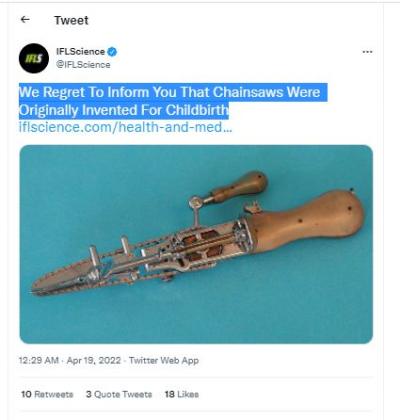 Chainsaw machine Originally Invented For Childbirth सध्या मोठ्या वेगाने वृक्ष तोडले जात आहेत. ही झाडे तोडण्यासाठी जी मशीन वापरली जातेय तिला चेनसॉ (Chainsaw) असे म्हटले जाते. परंतू या मशीनचा शोध काही झाडे तोडण्यासाठी लावण्यात आला नव्हता.