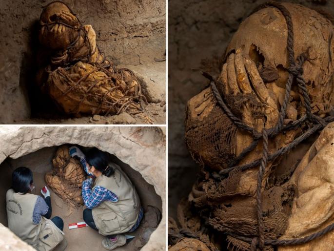 1 / 5पेरू या देशातील लीमा शहराच्या परिसरात 800 वर्षांपूर्वीच्या एका mummy चा म्हणजेच मानवी सांगाड्याचा शोध लागला आहे. त्याचबरोबर या mummy बरोबर भाजीपाला आणि काही हत्यारंदेखील सापडली आहेत.2 / 5Archaeologist पीटर वान डेलन लूना यांनी याविषयी बोलताना म्हटलंय की ही ममी लीमा क्षेत्रात शोधली गेली होती. आता हा मानवी सांगाडा पुरूषाचा आहे की स्त्रीचा हे अजून स्पष्ट झालेलं नाही.3 / 5या ममीच्या पूर्ण शरीराला दोरीनं बांधण्यात आलं आहे आणि चेहरा झाकण्यात आला आहे. ही त्या काळातील अंत्यसंस्कारांची पद्धत असू शकते. असं स्टेट यूनिवर्सिटी ऑफ सॅन मार्कोसचे वॅन डालन लूना यांनी म्हटलं आहे.4 / 5लीमा शहराच्या आसपासच्या परिसरात जमिनीखाली ही ममी सापडली आहे. त्यात चीनी मातीच्या वस्तू आणि दगडी हत्यारंदेखील सापडली आहेत.5 / 5पेरू हा देश इंका साम्राज्याच्या आधी आणि नंतर शेकडो आर्कियोलॉजिक स्थानांचं घर राहिलेलं आहे. त्याचा प्रभाव हा दक्षिणी इक्वाडोर आणि कोलंबियापासून तर मध्य चिली पर्यंत तब्बल ५०० वर्ष होता.