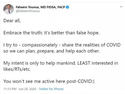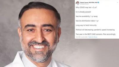 अमेरिकेच्या मेरीलँड विद्यापीठाच्या हॉस्पिटलमधील साथरोग विभागाचे प्रमुख आणि कोरोनावर उपचार करणारे डॉक्टर फहीम युनूस यांनी जगाला इशारा दिला आहे. त्यांनी ट्विट करून कोरोनाशी संबंधित काही गोष्टी सांगितल्या आहेत.