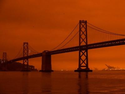 कॅलिफोर्नियाच्या जंगलात लागलेली आग अद्यापही धुमसते आहे. त्यामुळे संपूर्ण आसमंत भगव्या रंगानं व्यापला आहे.