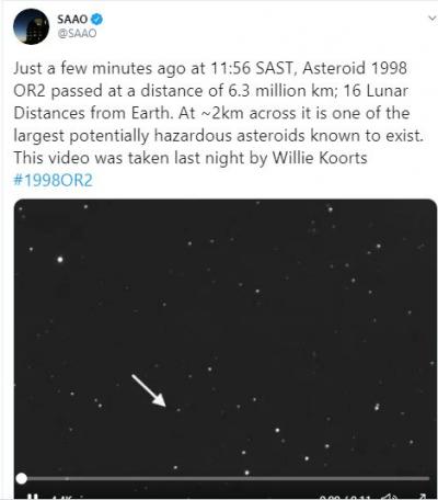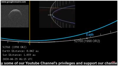अंतराळातून रॉकेटच्या तिप्पट वेगाने जाणारा एक मोठा उल्कापिंड 1998 OR2 पृथ्वीच्या जवळून गेला आहे. या उल्कापिंडमुळे पृथ्वीला कोणताही धोका नव्हता. कारण हा उल्कापिंड ६३ लाख किमीवरून पुढे गेला आहे. तो याआधी १२ मार्च २००९ मध्ये पृथ्वीपासून २.६८ कोटी किमी लांबीवरून गेला होता. आता घाबरायचे कारण नसल्याचे वैज्ञानिकांनी स्पष्ट केले आहे.