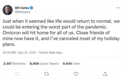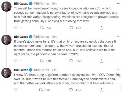 पॉझिटिव्ह नोटने केला समारोप - बिल गेट्स शेवटी म्हणाले, यातच एक चांगली बातमी अशी की, ओमायक्रॉन अत्यंत वेगाने पुढे जातो. एखाद्या देशात पसरल्यानंतर, संसर्गाची लाट 3 महिन्यांपेक्षा कमी कालावधीत संपते. एवढेच नाही, तर जग नेहमीसाठीच असे राहणार नाही. एक दिवस महामारी संपेल. जर आपण एकमेकांची काळजी घेतली तर ही वेळ लवकरच येईल, असेही गेट्स म्हणाले.