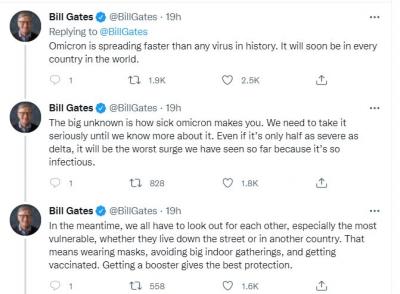 ओमिक्रॉनचा संक्रमण दर अधिक - गेट्स पुढे म्हणतात, ओमिक्रॉनचा हा नवा व्हेरिअंट पूर्वीच्या कोरोना व्हायरस व्हेरिअंट्सच्या तुलनेत अधिक वेगाने पसरत आहे. तो लवकरच जगातील प्रत्येक देशाला आपल्या कवेत घेईल. यासंदर्भात आपल्याला आणखी फारशी माहितीही नाही.
