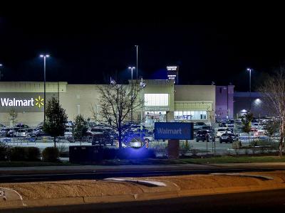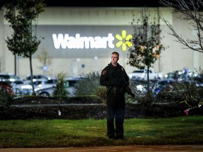 गोळीबाराच्या घटनेनंतर वॉलमार्टच्या दुकानाबाहेर तैनात असलेला पोलीस. या गोळीबारात दोघांचा मृत्यू झाला.