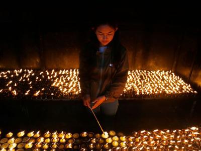 नेपाळची राजधानी काठमांडूमध्ये एक बौद्ध तरुणी भगवान बुद्धांसमोर दीप प्रज्वलित करताना.