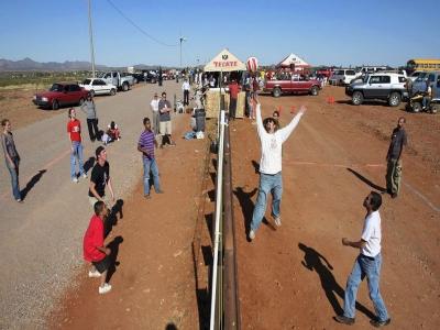 द युनायटेड स्टेट्स आणि मेक्सिकोच्या सीमारेेषेवर दोन्ही देशातील नागरिक व्हॉलीबॉल खेळत आहेत
