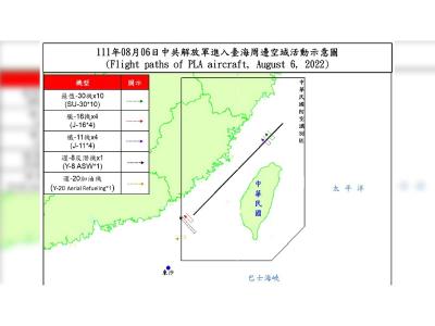 तैवान संरक्षण मंत्रालयानं ट्विटरवर दिलेल्या माहितीनुसार ६ ऑगस्ट २०२२ रोजी तैवानच्या खाडीत चीनचे १० सुखोई-३०, चार j-16, चार J-11 फायटर जेट्स दिसून आल्याचं म्हटलं आहे. याशिवाय एक Y-8 ASW देखरेख विमान आणि एक Y-20 हवाई रिफ्युलिंग एअरक्राफ्टचा समावेश आहे. तैवानच्या संरक्षण मंत्रालयानं या विमानांचे फ्लाइट मार्ग देखील दाखवले आहेत.