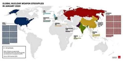 जानेवारी २०२० पर्यंत अण्वस्त्र संपन्न देशात अमेरिका, रशिया, ब्रिटन, फ्रान्स, चीन, भारत, पाकिस्तान, इस्त्राईल आणि उत्तर कोरिया यांचा समावेश आहे. एकूण त्यांच्याकडे १३,४०० अण्वस्त्रे असल्याचा अंदाज आहे.