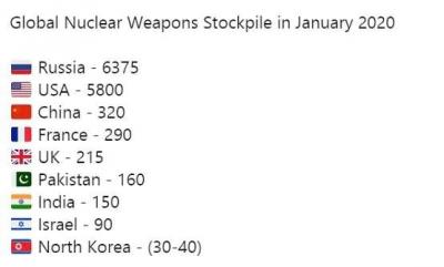 याशिवाय ब्रिटनकडे २१५ अणुबॉम्ब आहेत, तेथे पाकिस्तानकडे १६०, भारताकडे १५० अणुबॉम्ब आहेत. त्याचवेळी इस्त्राईलकडे ९० आणि उत्तर कोरियाकडे ३० ते ४० अणुबॉम्ब आहेत.