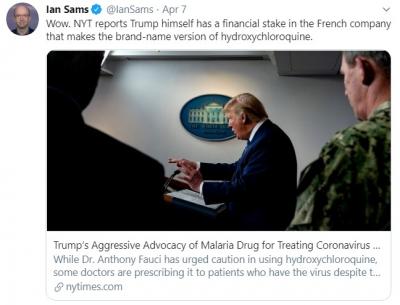 काही दिवसांपूर्वी अमेरिकन वृत्तपत्र ‘न्यूयॉर्क टाईम्स’ च्या संकेतस्थळावर हे उघड झाले होतं की डोनाल्ड ट्रम्प हे मलेरियावरील औषध हायड्रॉक्सीक्लोरोक्वीच्या मागे का आहेत. यात डोनाल्ड ट्रम्प यांचा वैयक्तिक फायदा असल्याचे मीडिया इन्स्टिट्यूटने म्हटलं होतं.