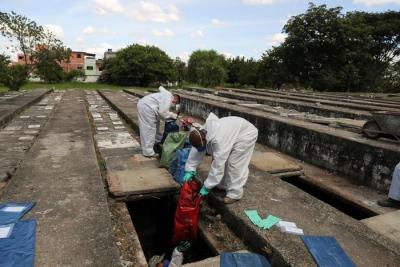 काही वर्षांपूर्वी दफन केलेल्या कबरींवरील वरील भाग काढण्यात येत असून तेथील सांगाडे काढण्यात येत आहे. साओ पालोमधील ब्राझीलमधील सर्वात मोठ्या कब्रस्तानापैकी एक असलेल्या विला फोरमोसा सिमेट्रीमध्ये कर्मचारी मास्क, पीपीई किट घालून दिवस-रात्र कबर खोदत आहेत.