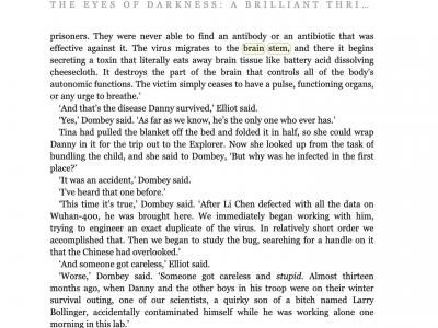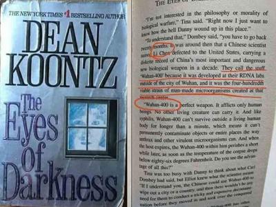 या कादंबरीच्या पुस्तकात वुहान -400 या व्हायरसचा उल्लेख आढळतो. वुहान व्हायरसचा एका प्रयोग प्रयोगशाळेतून जैविक शस्त्र म्हणून तयार करण्यात आला असल्याचे येथे नमूद करण्यात आले आहे.
