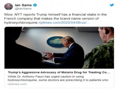 वेबसाइटने केलेल्या दाव्यानुसार फ्रान्सची औषध उत्पादन कंपनी सैनोफीशी संबंध डोनाल्ड ट्रम्प यांचा वैयक्तिक फायदा आहे. ट्रम्प यांचेही कंपनीत समभाग आहेत. ही कंपनी प्लॅकेनिल या ब्रँड नावाने बाजारात हायड्रॉक्सीक्लोरोक्विन औषध विकते.