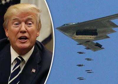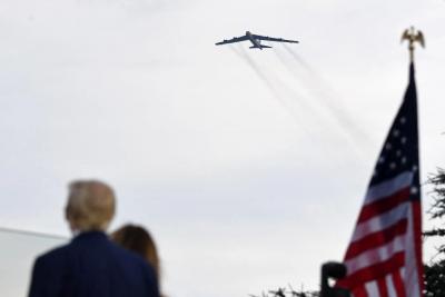 डोनाल्ड ट्रम्प खेळत असलेल्या गोल्फ मैदानावर बी-२ या अणूबॉम्ब फेकू शकणाऱ्या विमानाची सावली दिसत आहे.