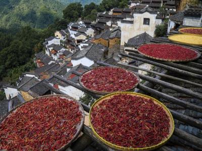 चीनच्या पूर्वेकडील भागात असलेल्या वुआयनच्या हुआंगलिंग गावात अशा प्रकारचे वाळवण पाहायला मिळते. मिरच्यांसह कडधान्य या परिसरात वाळविली जातात. यासाठी घरांच्या छतावर खास सोय केलेली दिसून येते.