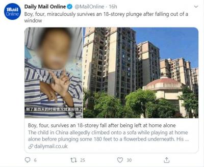 चीनच्या हुबेई प्रांतातील शियांगयांग शहरात एक चार वर्षांचा चिमुकला आपल्या घरी एकटाच होता. त्याचे आई-वडील बाहेर असतात. हा मुलगा सोफ्यावर चढला आणि लागूनच असलेल्या एका खिडकीतून तब्बल 180 फूट खाली पडला. ही घटना 6 ऑगस्टला घडली. (सांकेतिक फोटो)