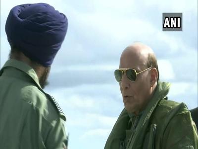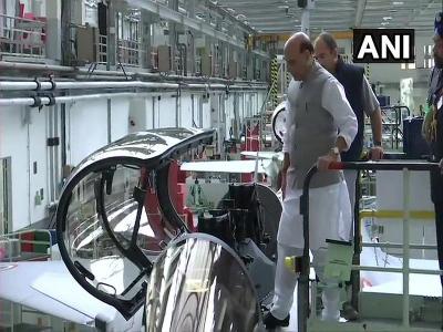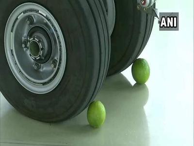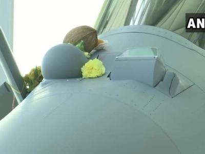या विमानातून राजनाथ सिंह यांनी उड्डाण केले त्या आधी त्यांनी विमानावर कुंकवाने ‘ओम’ लिहून फुले वाहिली आणि नारळ ठेवले.